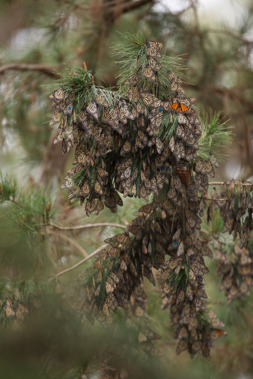 Monarch butterfly population overwintering in Pacific Grove, California. Blue tags on butterflies. North American monarchs travel up to an astonishing 3,000 miles in an annual migration from their summer breeding habitat to overwintering grounds.
