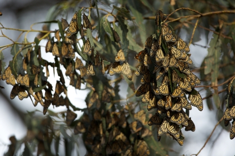 Monarch butterfly population overwintering in Pismo Beach, California. North American monarchs travel up to an astonishing 3,000 miles in an annual migration from their summer breeding habitat to overwintering grounds.