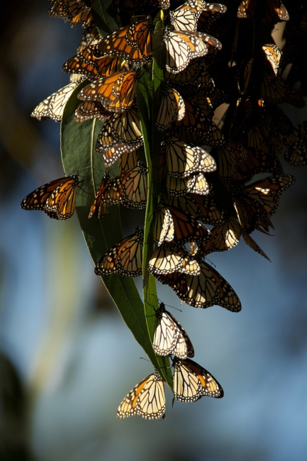 Monarch butterfly population overwintering in Pismo Beach, California. North American monarchs travel up to an astonishing 3,000 miles in an annual migration from their summer breeding habitat to overwintering grounds.