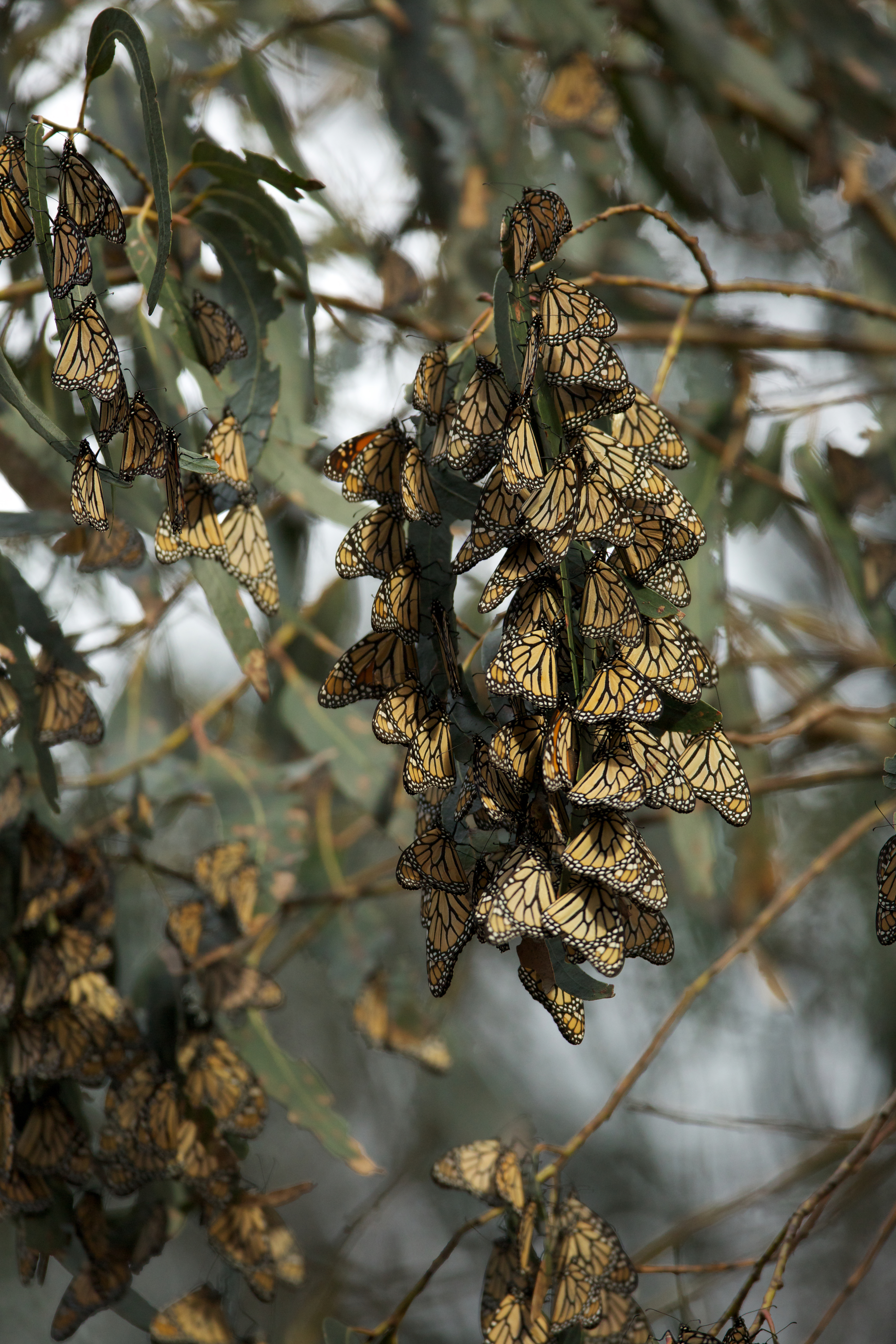 Monarch butterfly population overwintering in Pismo Beach, California. North American monarchs travel up to an astonishing 3,000 miles in an annual migration from their summer breeding habitat to overwintering grounds.