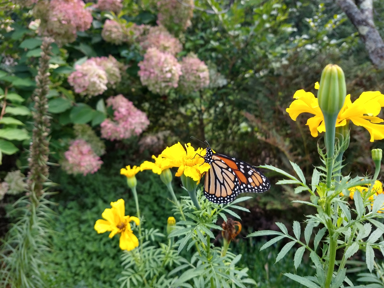 A monarch butterfly pollinates a marigold flower in a small garden.