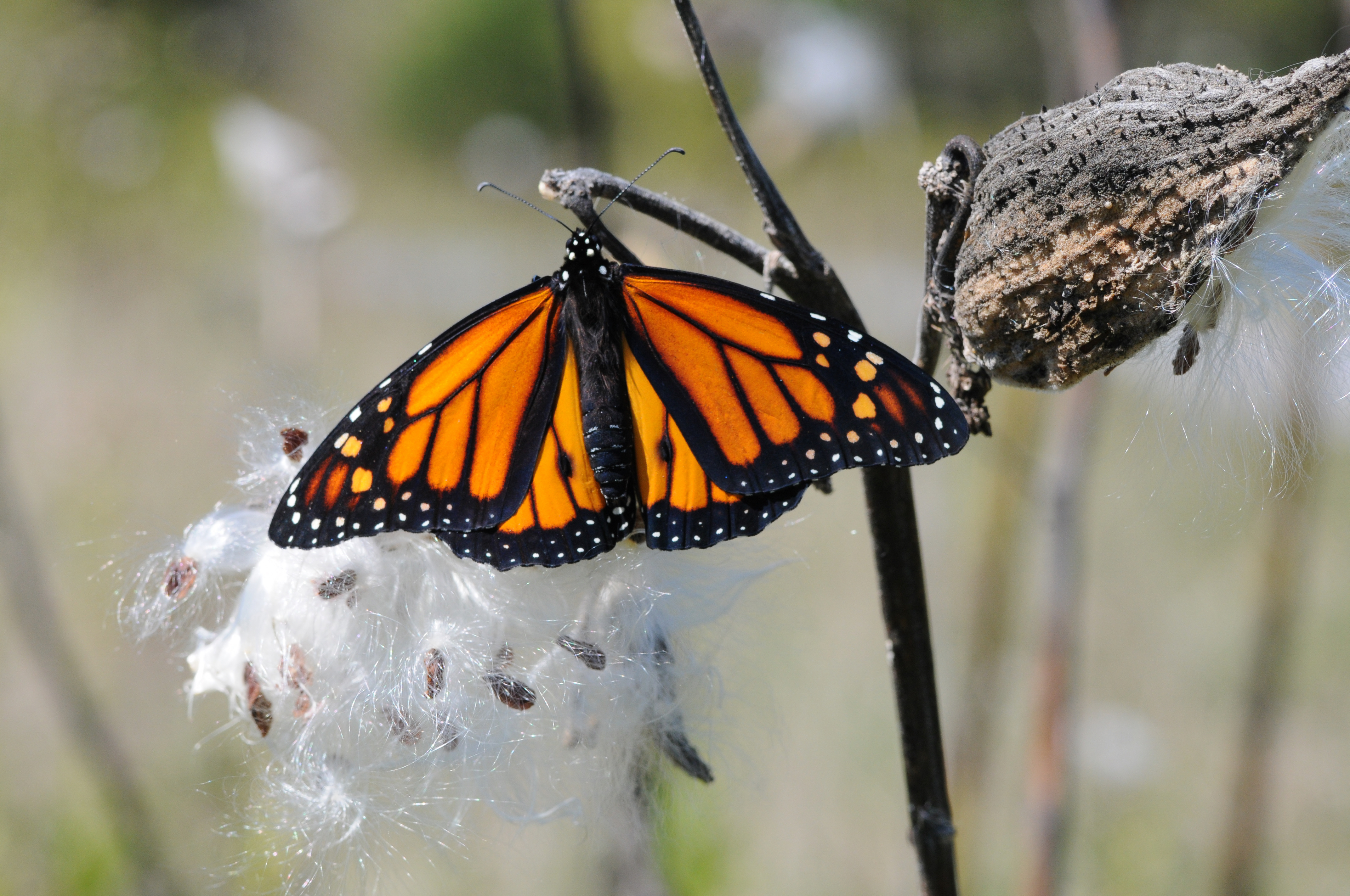Monarch butterfly rests on milkweed pod