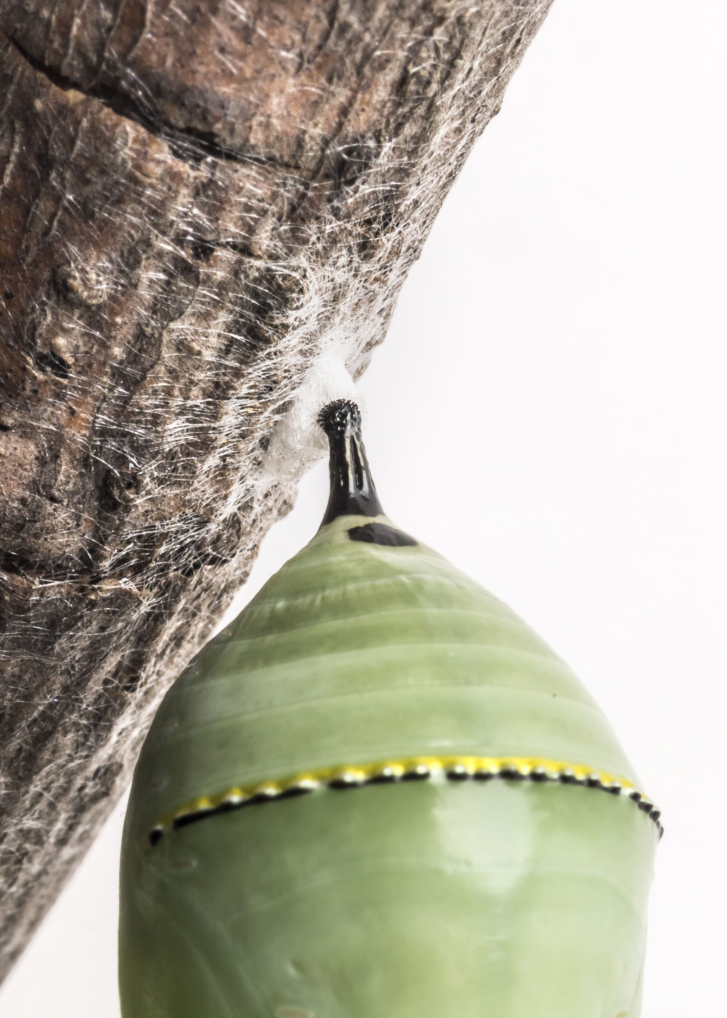 Monarch chrysalis pupa stage. Fattening larvae become juicy, colorful caterpillars, then create a hard protective case around themselves as they enter the pupa stage.