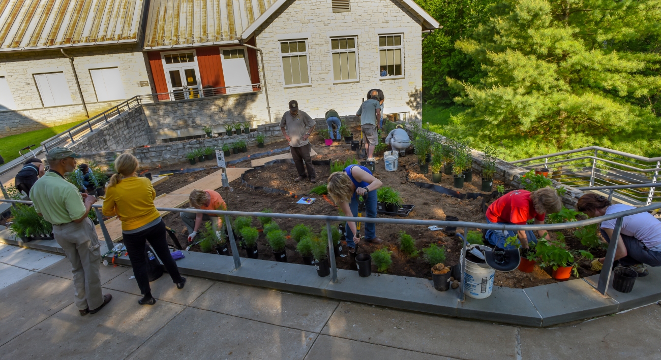 Volunteers plant native flowering plants in a Monarch Waystation Garden to create, conserve, & protect Monarch habitats.