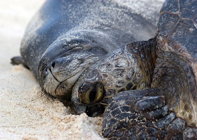 Monk Seal and Turtle Resting Papahānaumokuākea Marine National Monument.
