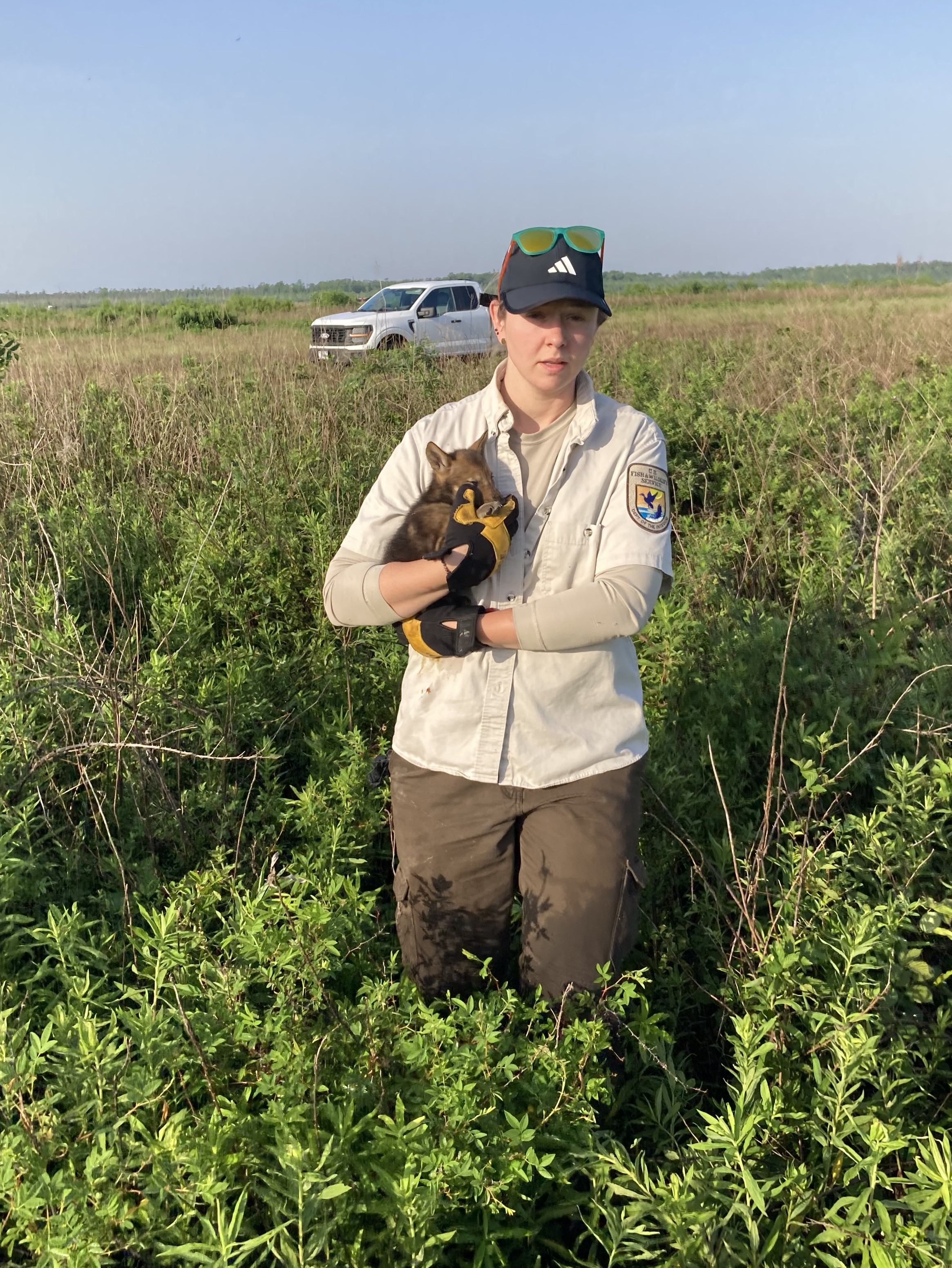 USFWS Wildlife Biologist Morgan Lewis hand captures a 5 week old pup on Alligator River National Wildlife Refuge in mid-May 2025 to be able to give vaccinations and a small abdominal transmitter.