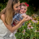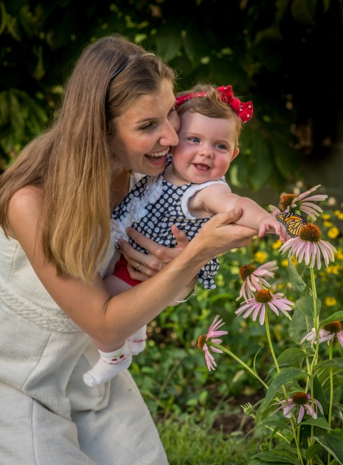 Mother and daughter look at monarch