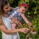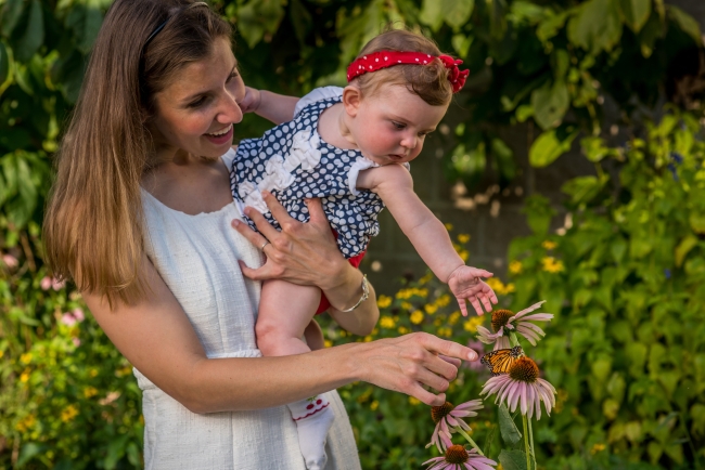 Mother and daughter look at monarch on flower