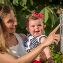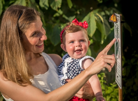 Mother and daughter look at monarch on sign
