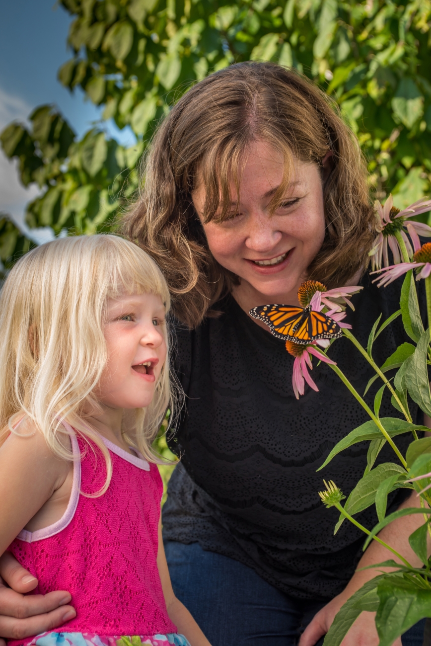 Mother and daughter view monarch on flower