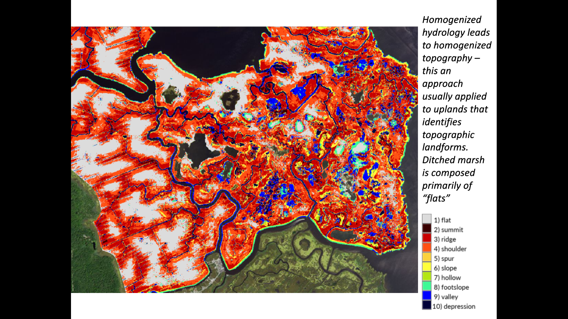 A slide from Joe Smith's analysis of the Motts Mullica Wilderness shows the rich topographical diversity of unditched marsh.
