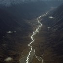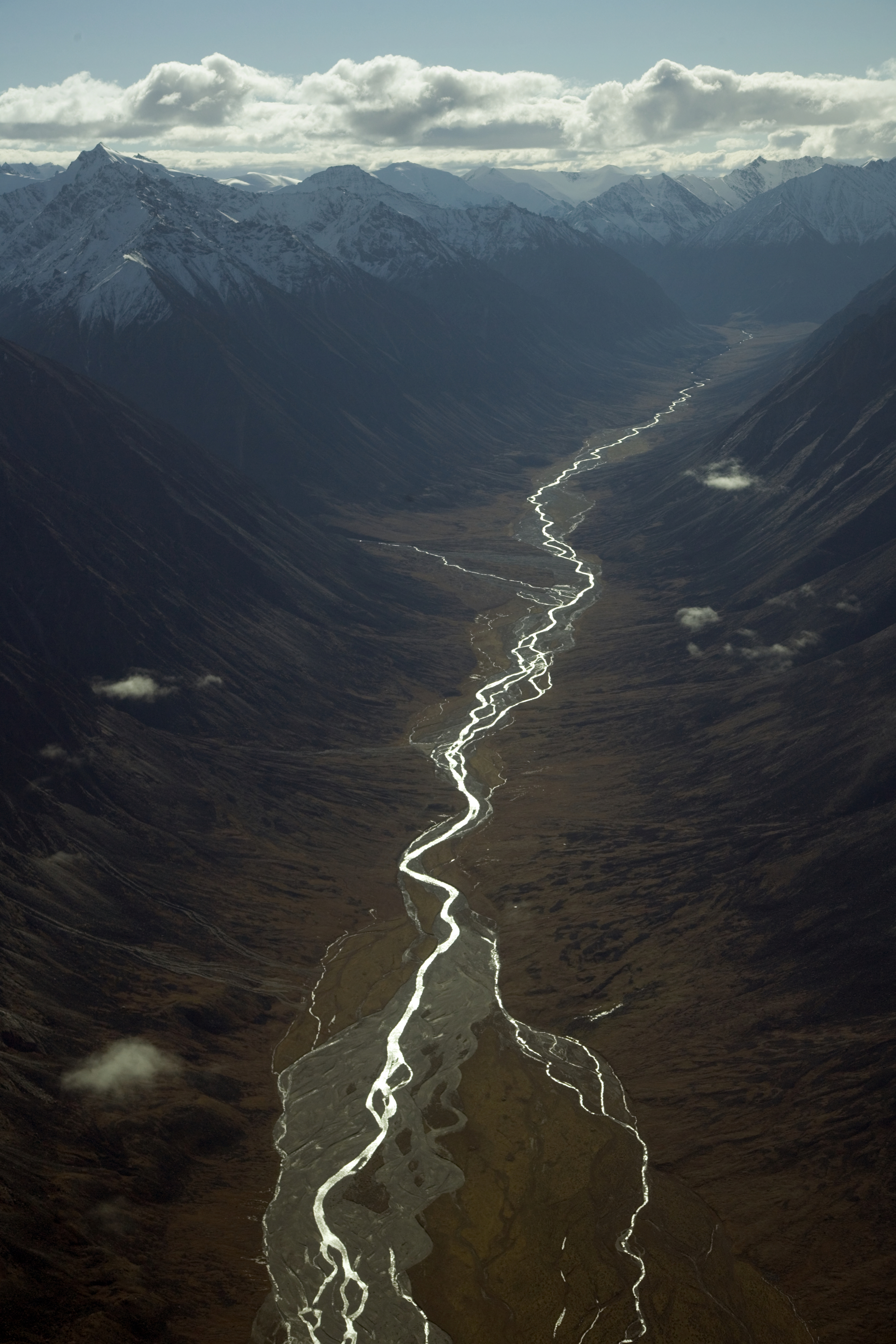 This picture depicts massive mountains surrounding a large, windy waterway at the Arctic National Wildlife Refuge.