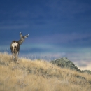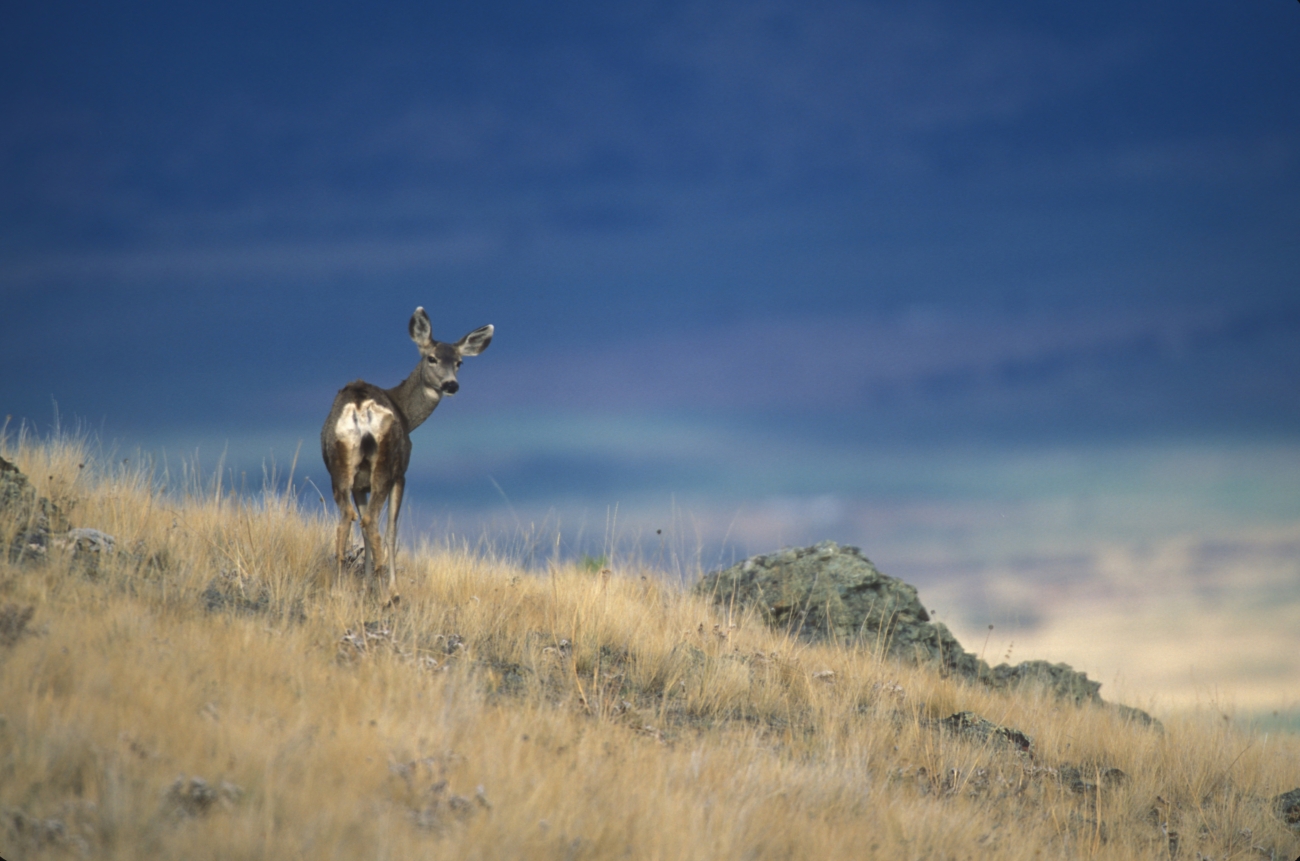 Mule deer standing on a scenic hillside in the National Bison Range