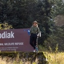 Musician-in-residence KT Tunstall stands alongside the Kodiak Refuge entrance sign in 2022.