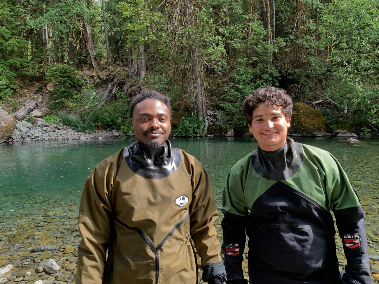 Darius Maddox and Carlos Olivas pause for a photo prior to taking the plunge in search of freshwater mussels.