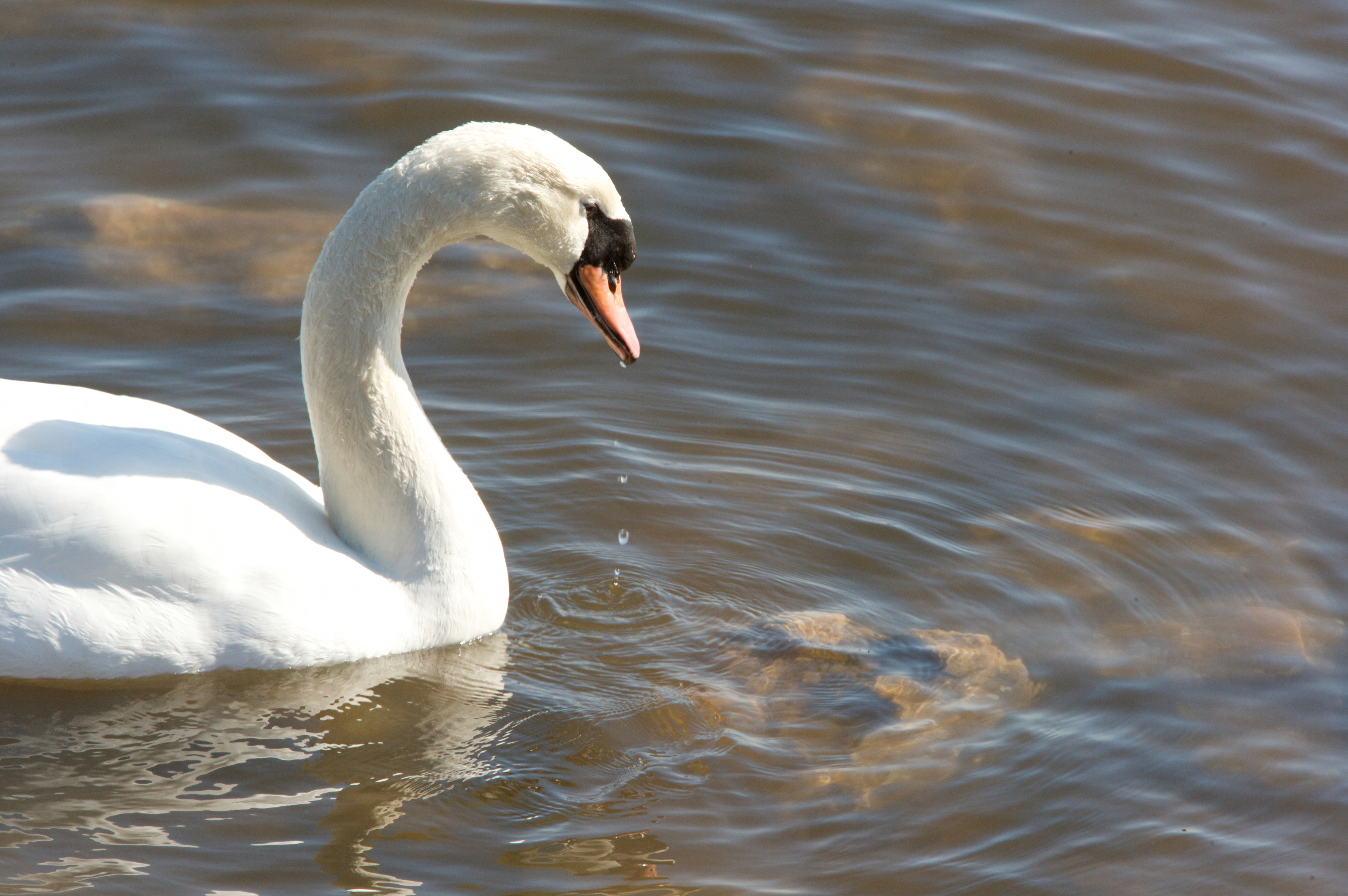 A profile view of a mute swan in the water at the Chesapeake Bay.