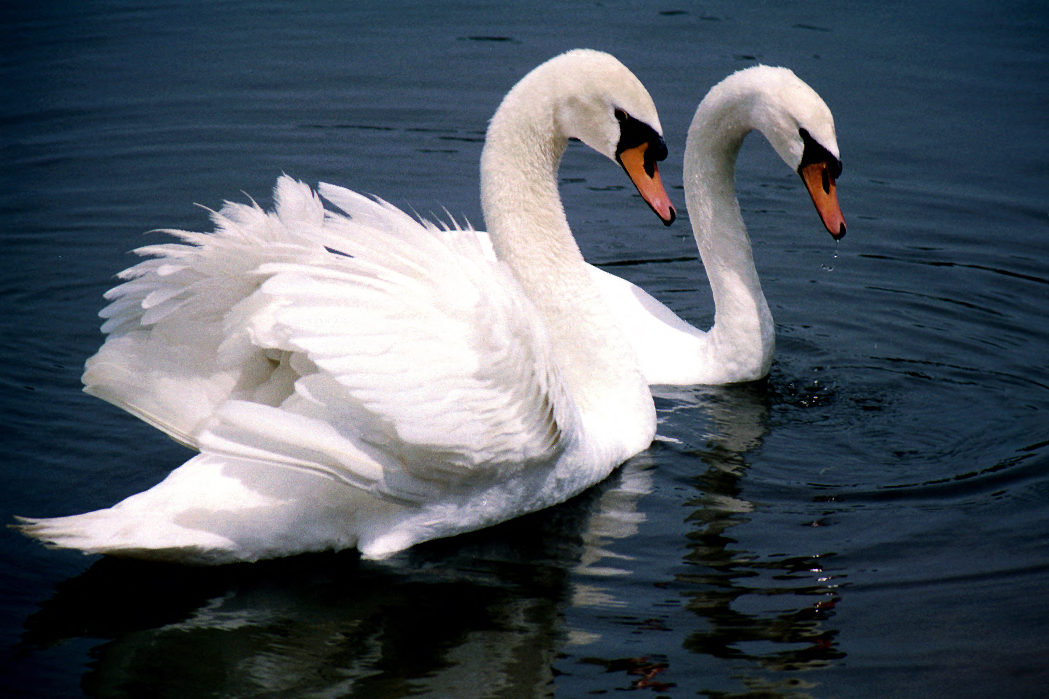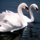 Mute Swans are very large waterfowl. They have heavy bodies, short legs, and a long, slender neck habitually held in a graceful S. The large, flat bill has a bulging knob at the base.