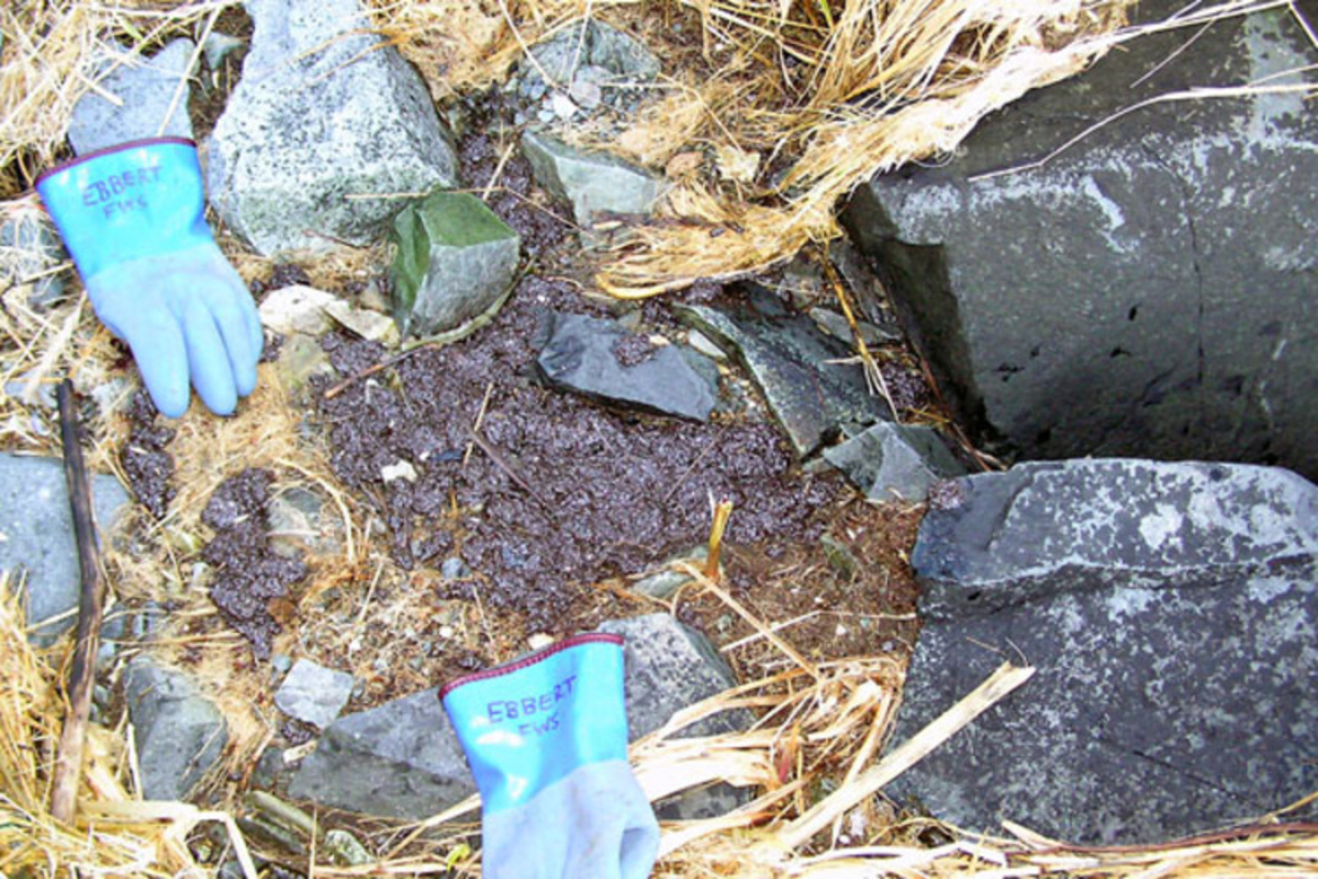 This tar seems splattered onto vegetation and has settled into this spot on top of the grass. U. S. Fish and Wildlife Service Response to Grounding/Oil Spill off Unalaska Background Information The U.S. Fish and Wildlife Service is responding to