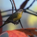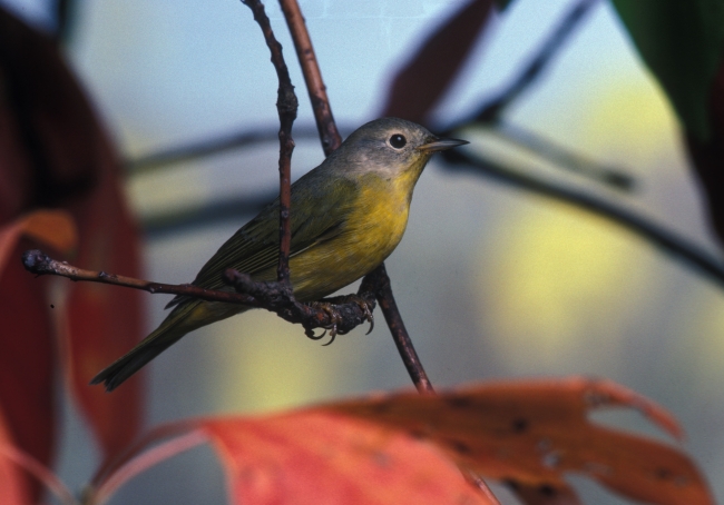 A close-up view of a Nashville Warbler perched on a Sassafras branch in the Fall.