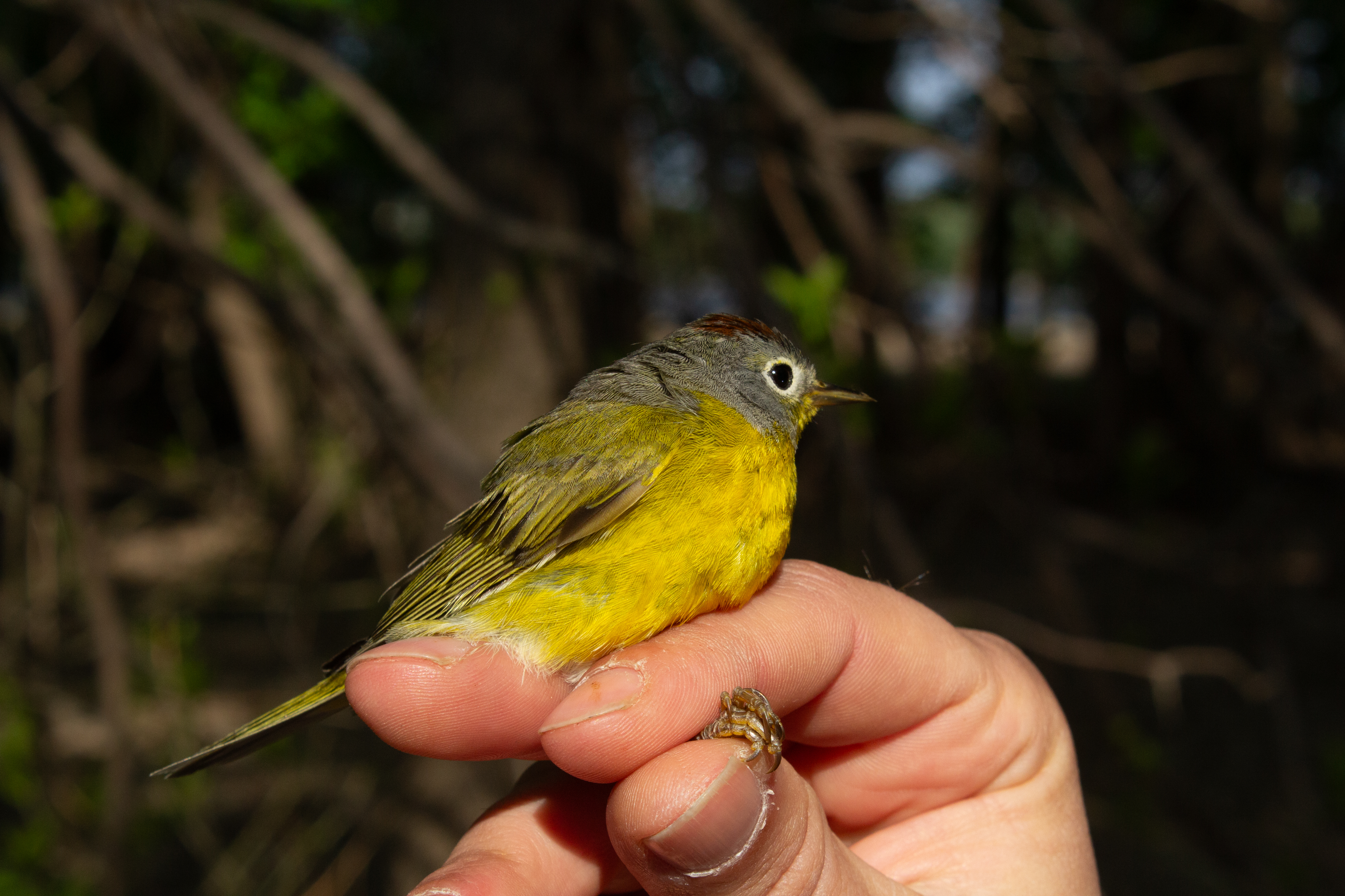 A Nashville Warbler that was captured in a mist net is held in hand.