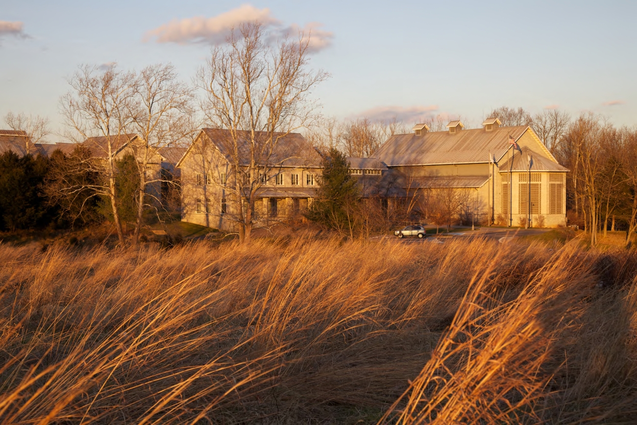This is a scenic view of a field with buildings in the background at the National Conservation Training Center.
