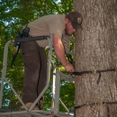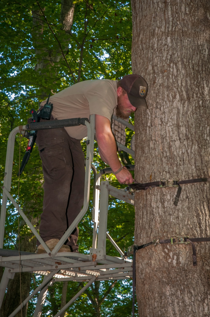 NCTC land management specialist inspecting deer stand for safety