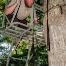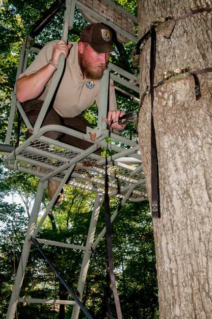 NCTC land management specialist inspecting deer stand for safety