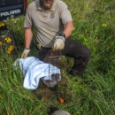NCTC land management specialist with live-trap, releasing trapped groundhog