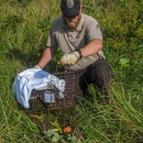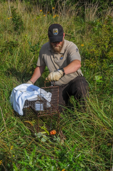 NCTC land management specialist with live-trap, releasing eastern cottontail