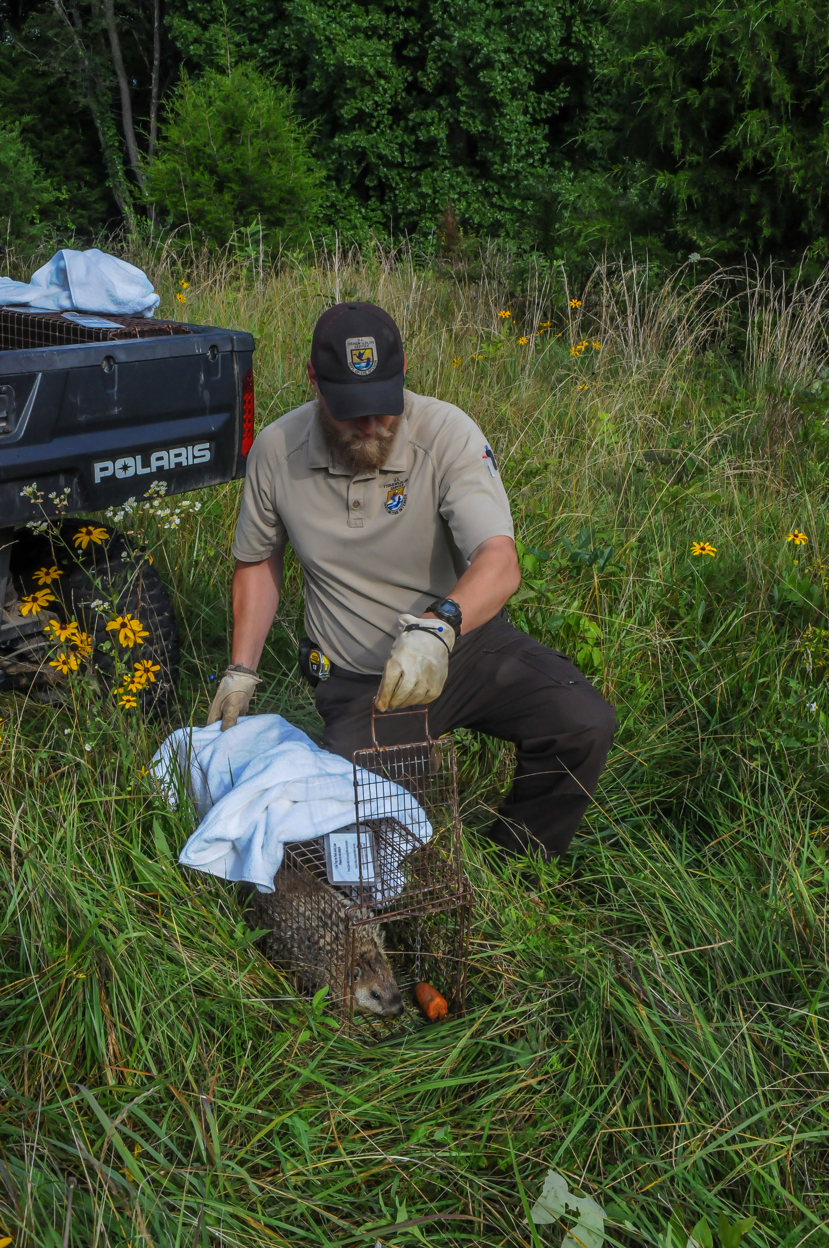 NCTC land management specialist with live-trap, releasing trapped groundhog