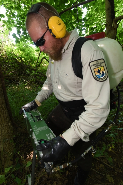 National Conservation Training Center land management specialist uses motorized injector to treat ash trees