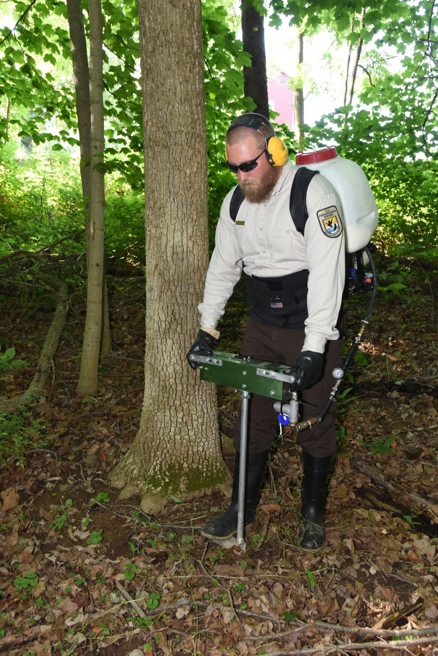 NCTC land management specialist uses motorized injector to treat ash trees for emerald ash borer