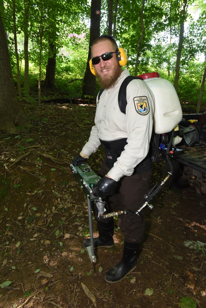 National Conservation Training Center land management specialist uses motorized injector to treat ash trees