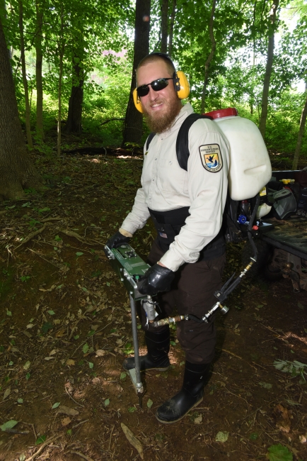 NCTC land management specialist uses motorized injector to treat ash trees for emerald ash borer