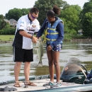 A girl and a volunteer inspects the catch of the day at the 2011 National River Bass Tournament.