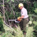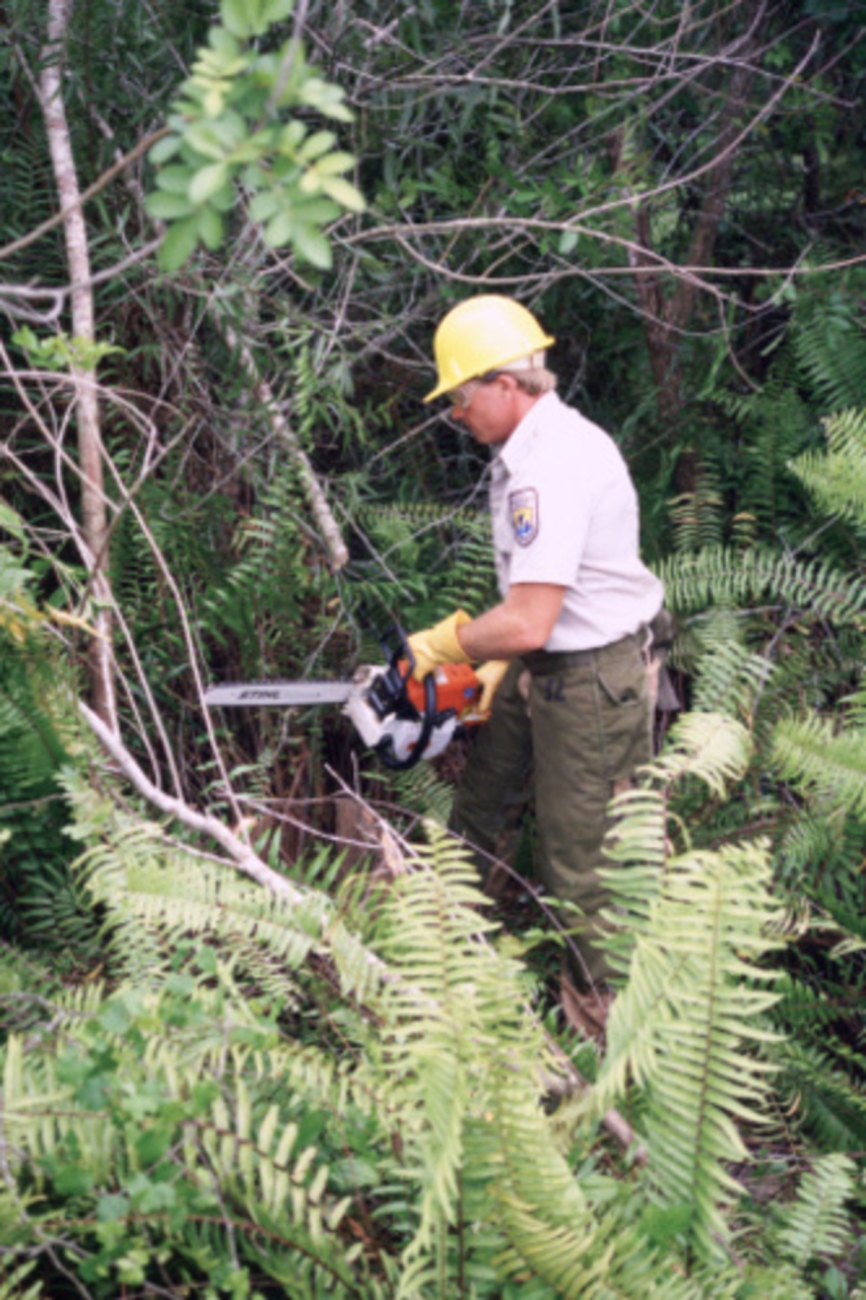 Fish and Wildlife Service employee chain sawing to control exotic invasive melaleuca. Vertical.