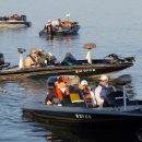 The participants of the 2009 Nation's River Bass Tournament ride on the Potomac River to begin fishing.