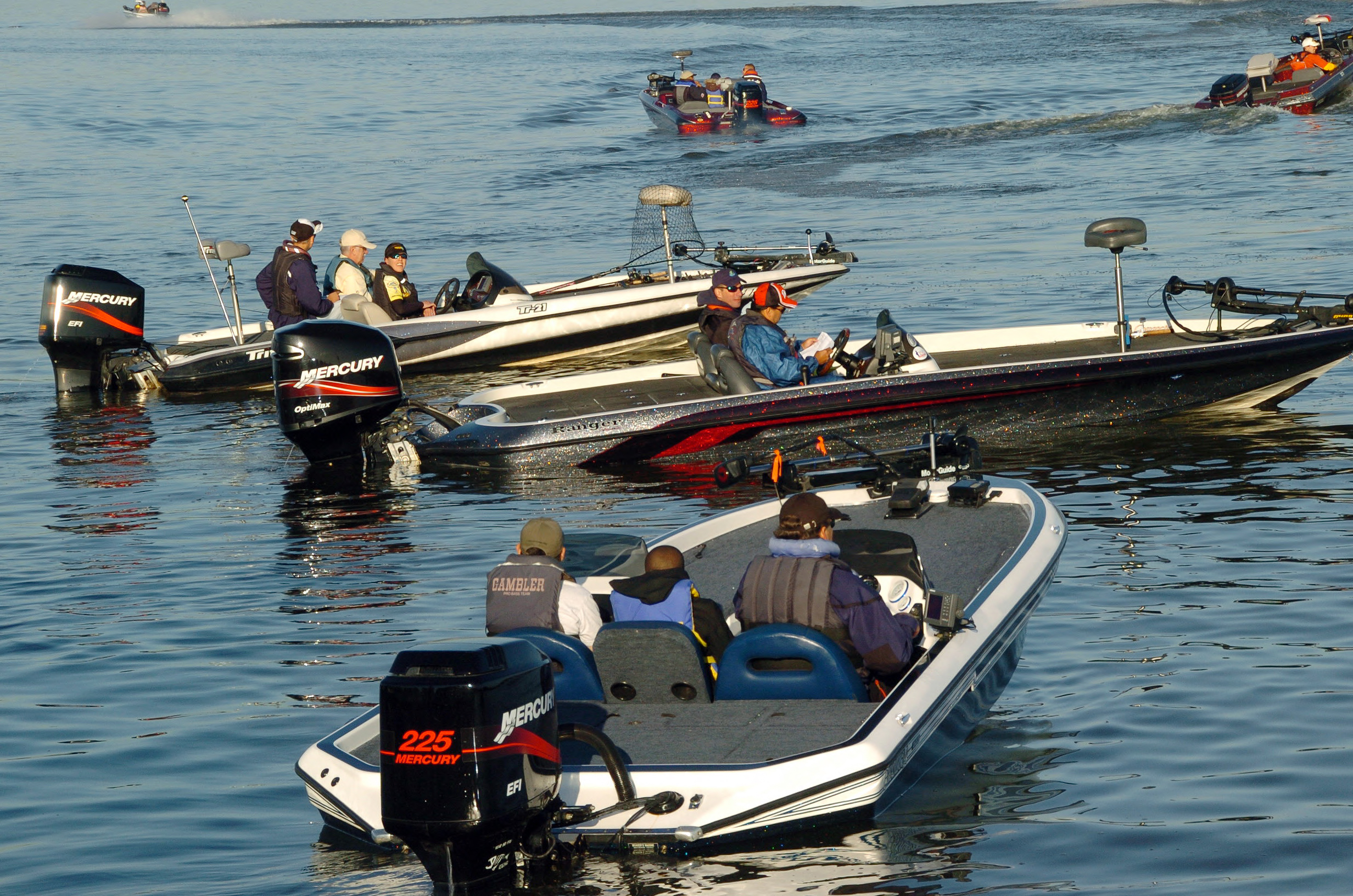 The participants of the 2009 Nation's River Bass Tournament ride in speedboats on the Potomac River.