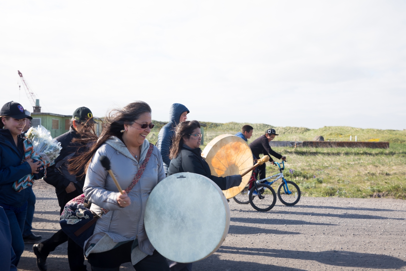 A Native Alaskan woman bangs a drum and leads a procession to St. Paul Island in Alaska