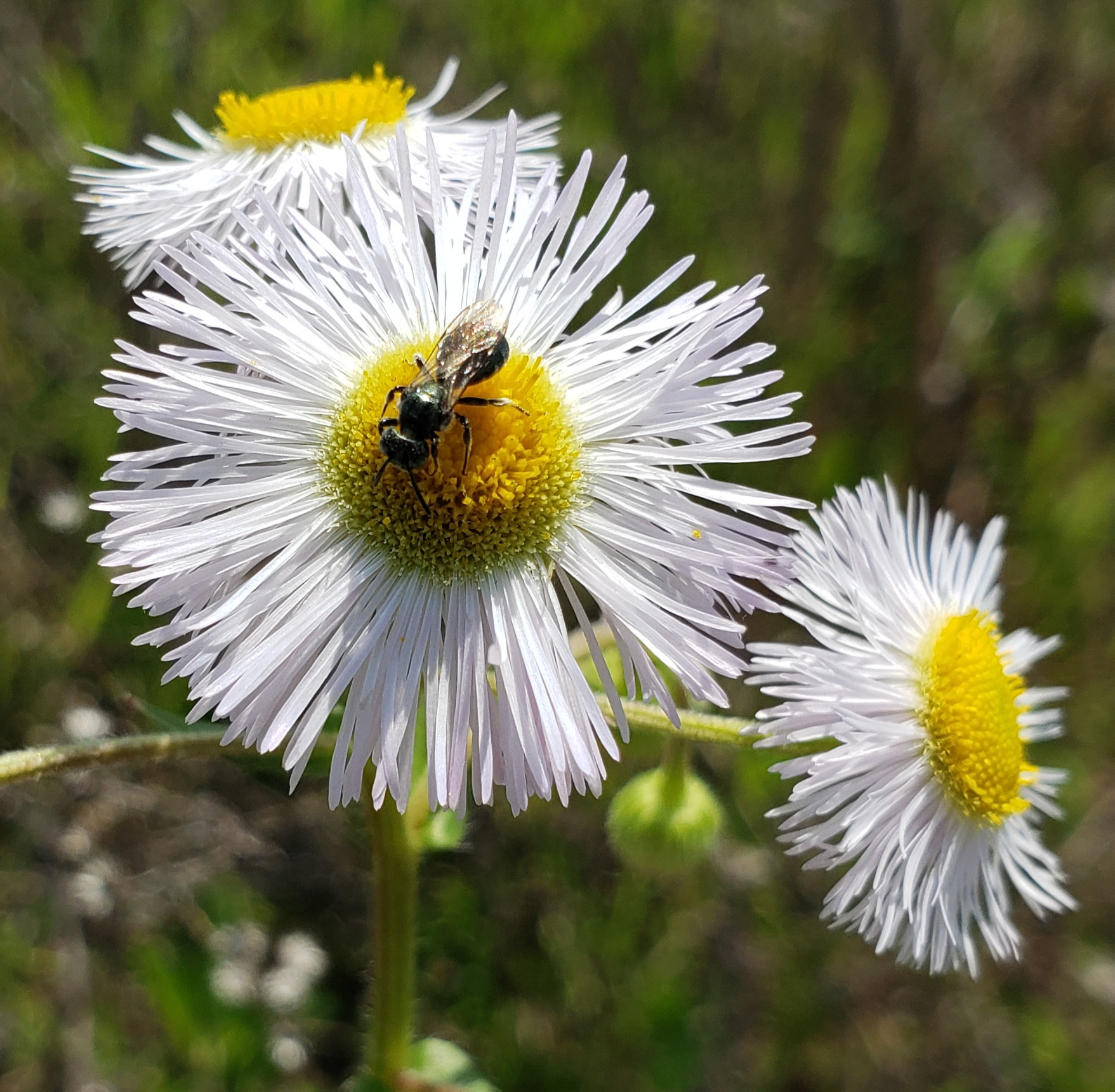 A native bee feeding on a Fleabane (Erigeron annuus) flower at one of the Great Lakes Restoration Initiative's Pollinator Task Force sites.