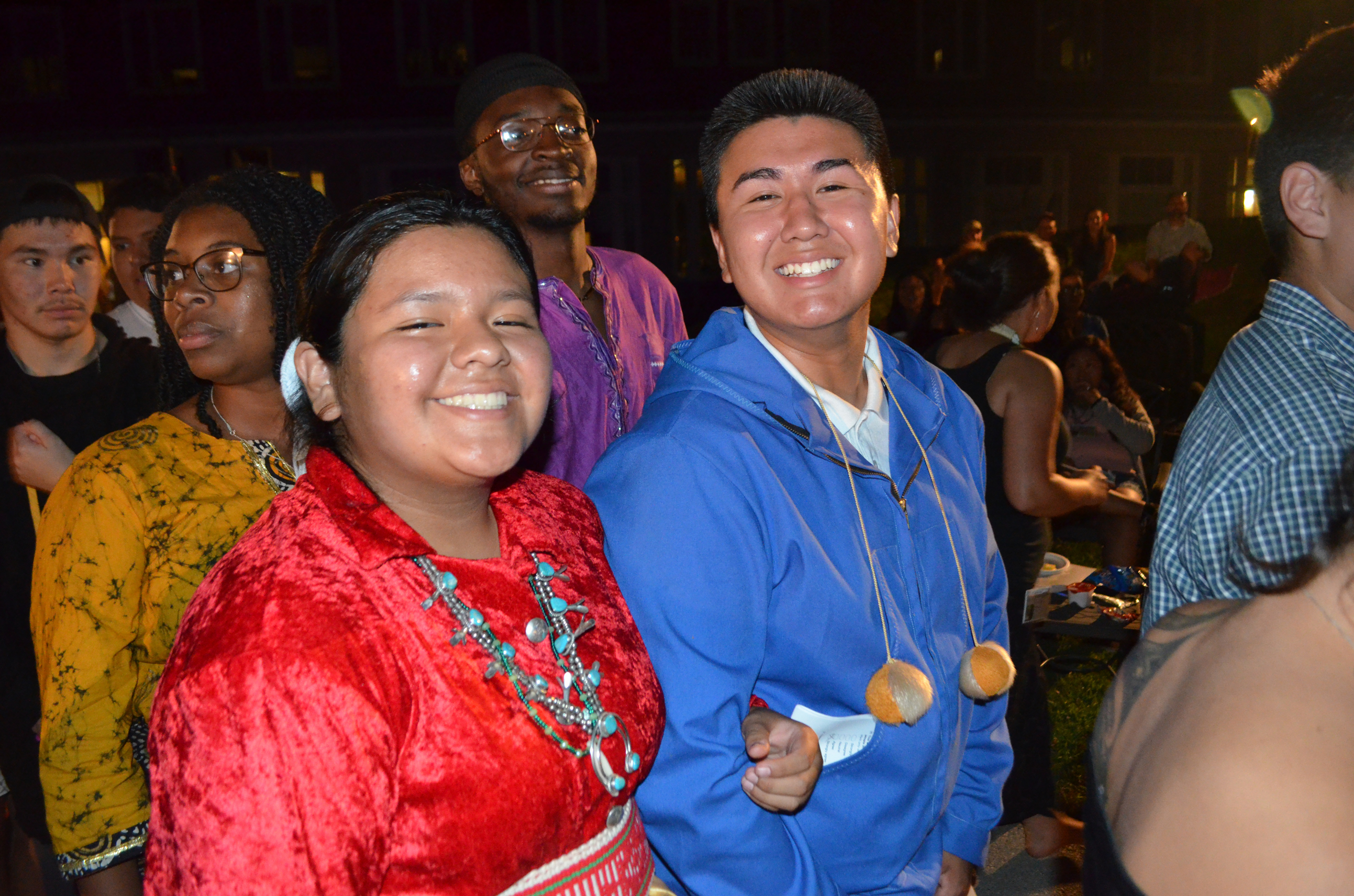 Two native youth in traditional clothing from the Native Youth Community Adaptation Leadership Congress smile at the camera while dancing at a night time cultural gathering.