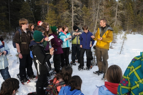 A group of youth are listening to an educator while nature journaling. Vermont Law Enforcement.