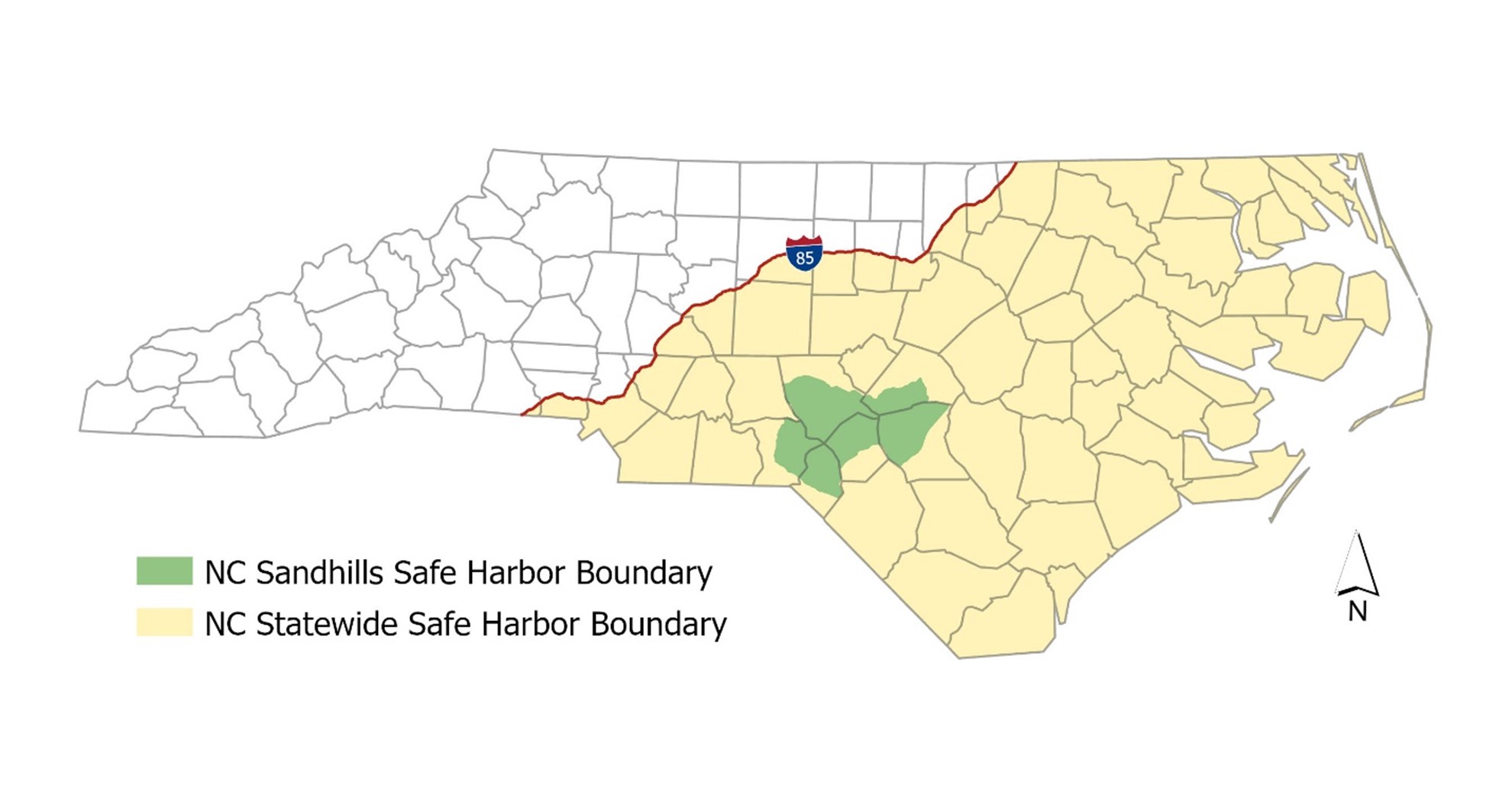 Map of the red-cockaded woodpecker Safe Harbor program boundaries in North Carolina.