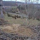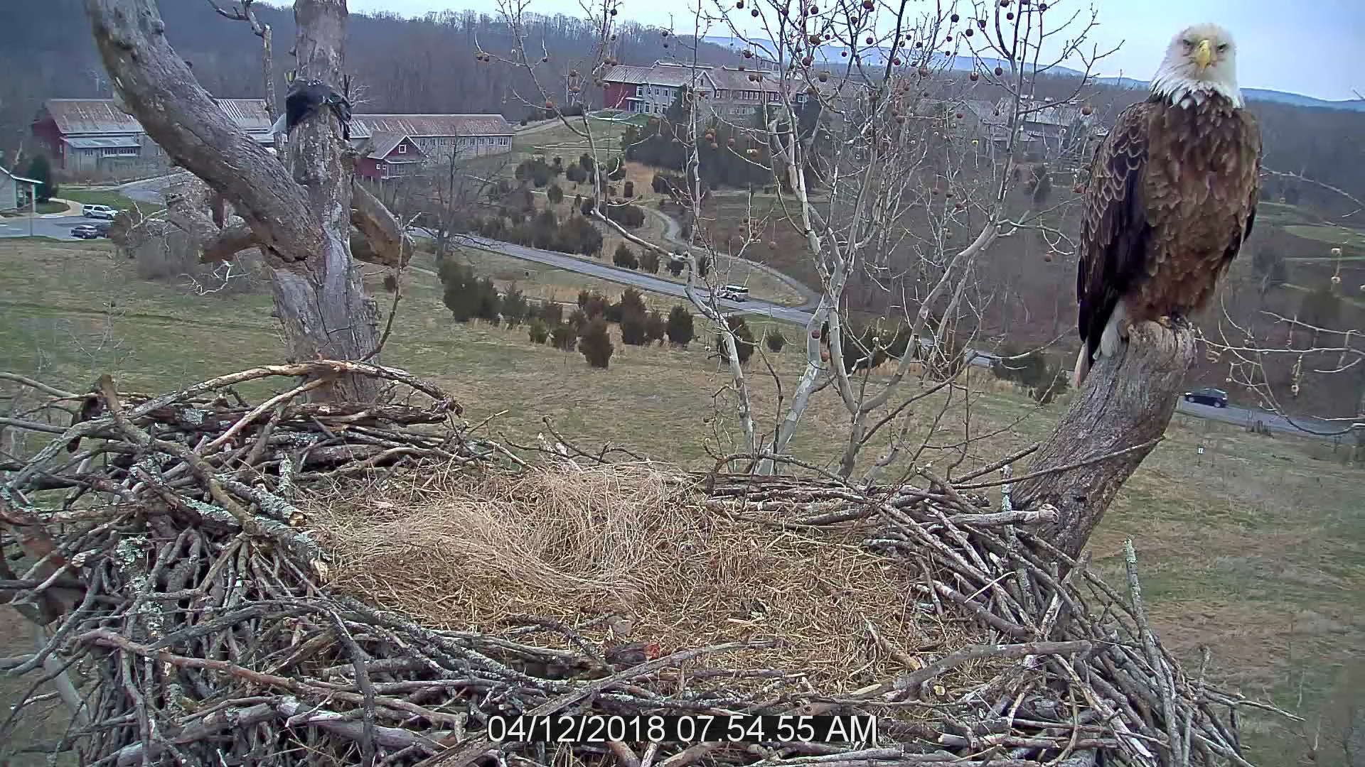 NCTC eaglecam from still capture showing close-up of eagle and nest with Kreate, Conservation Library, and Instructional West buildings in the background.