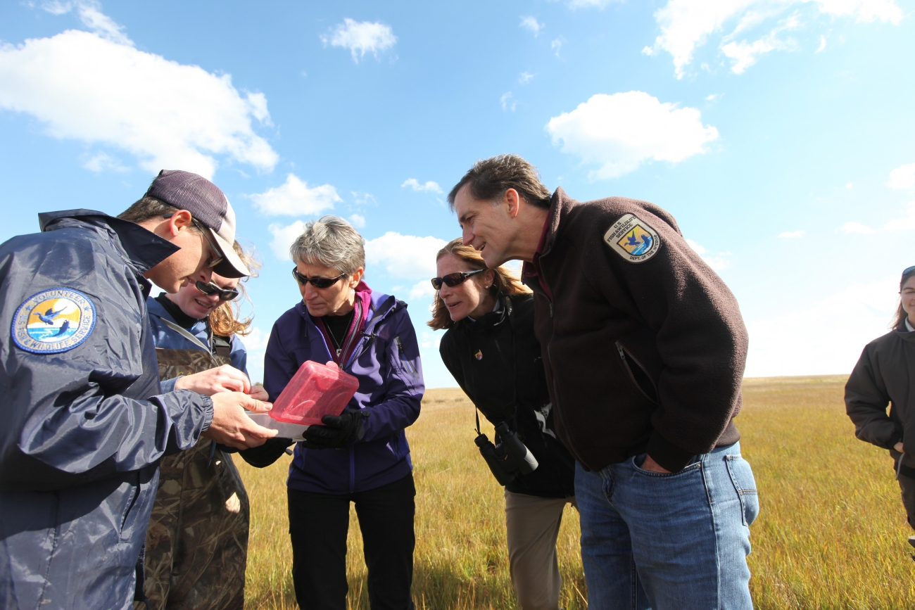 Secretary Jewell, U.S. Fish and Wildlife Service Director Dan Ashe and Northeast Regional Director Wendi Weber checking out small fish and invertebrates sampled by interns and volunteers from the refuge marsh.