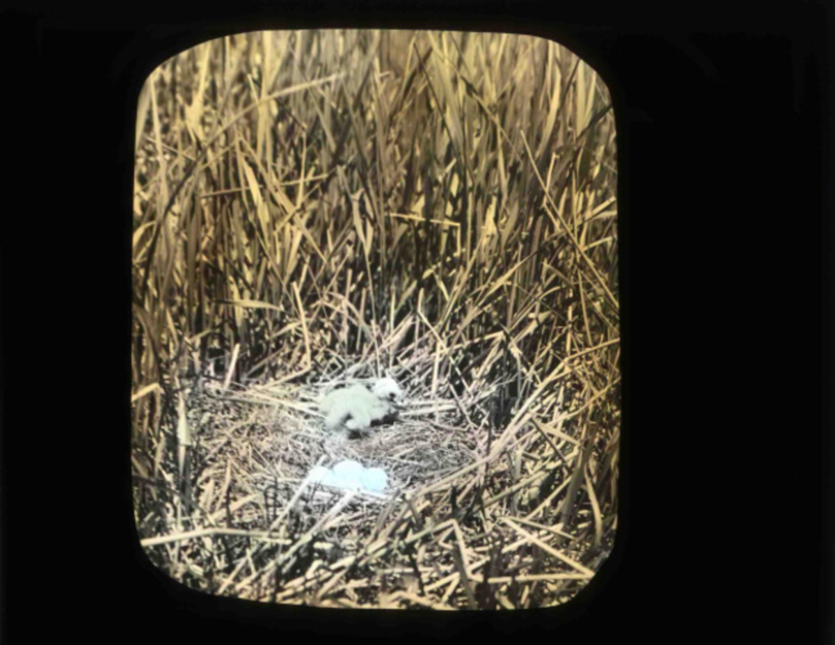 A nest site captured by Finley and Bohlaman in a hand painted glass slide taken at Mlaheur lake in 1908. Finley and Bohlman's photography of the area would help protect it from plume hunters in 1908 when it was declared a bird refuge.