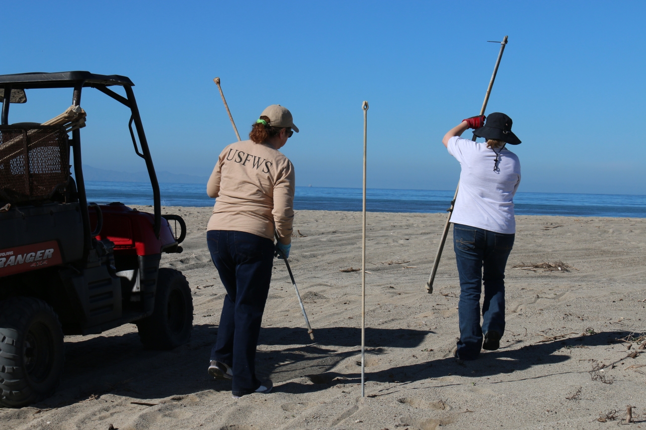 U.S. Fish and Wildlife Service ecological staff volunteered their morning to assist in fence installation preparing for nesting season for Western Snowy Plovers and California Least Terns.