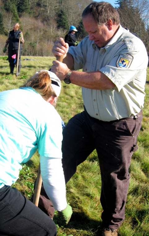 USFWS Portland-based staff and partners from the Institute for Applied Ecology partnered with Nestucca Bay National Wildlife Refuge to plant early blue violets and pearly everlasting flowers on the refuge's Cannery Hill unit. These flower are native to the refuge's coastal prairie habitat. The project is part of a joint effort to aid in the recovery of the Oregon silverspot butterfly, a Federally threatened species. USFWS maintenance specialist, Peter Martin, digs into his role as the "dibbler." Volunteers split off into groups of three to make their way through the 4,200 early blue violet plugs that would reach that day.
