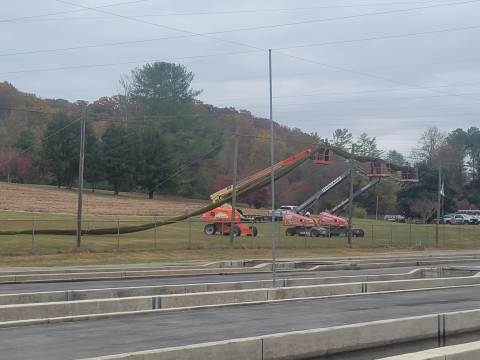 Net sections are 300ft long and up to 300ft wide to span the full width of the hatchery. Each section weighs just over 914lbs total so it is lifted sequentially in tandem.