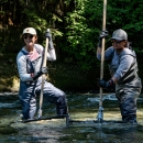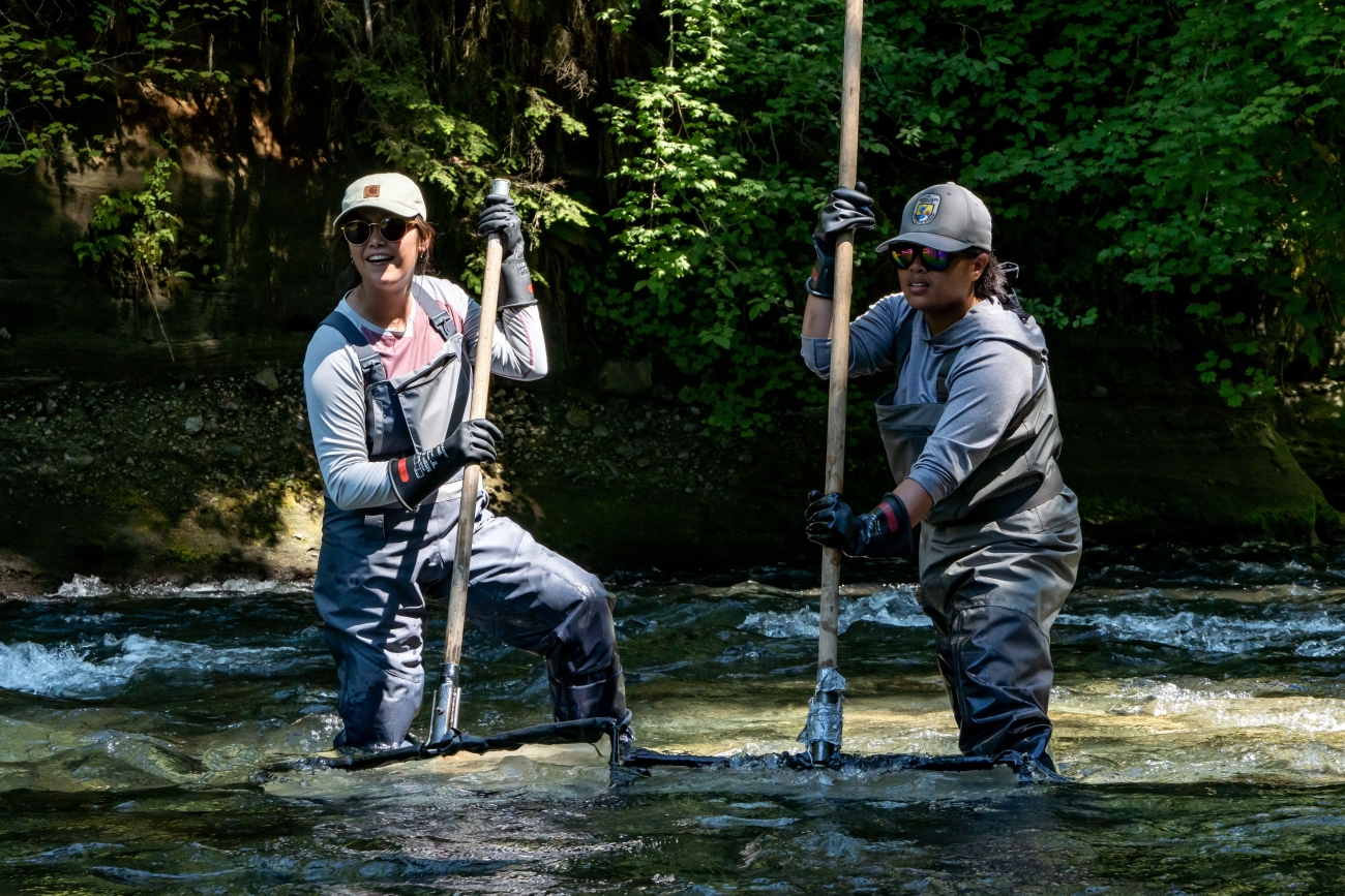 Bureau of Indian Affairs WaterCorps intern Maya Bass (left) and Pathways employee Angel Velasquez (right) wait with nets while electrofishing in the Dosewallips River, Washington.